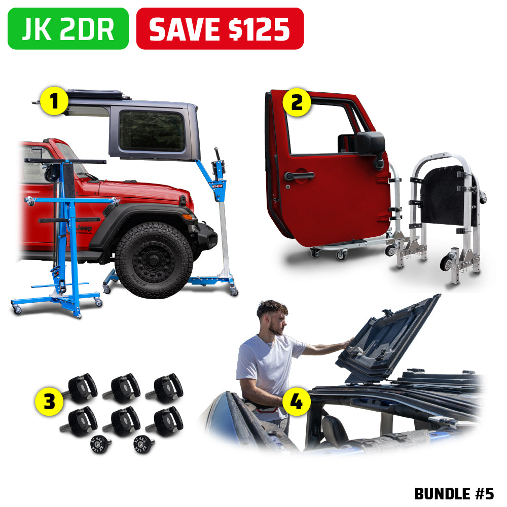 Achieve instant, hassle-free open-air freedom! This all-in-one bundle includes the Hard Top Lift, EZ FlipTop system, Quick Release Thumb Screws, and Door Cart. Get the entire system for quick, one-person top and door removal, and maximize your savings.