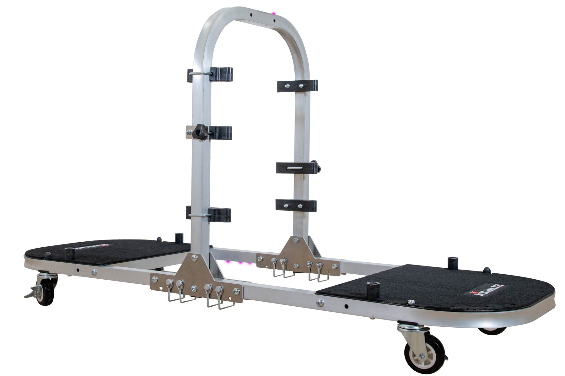 Expanded, empty EZ4X4 aluminum door cart against white background, showing durable frame and ready-to-use storage design.