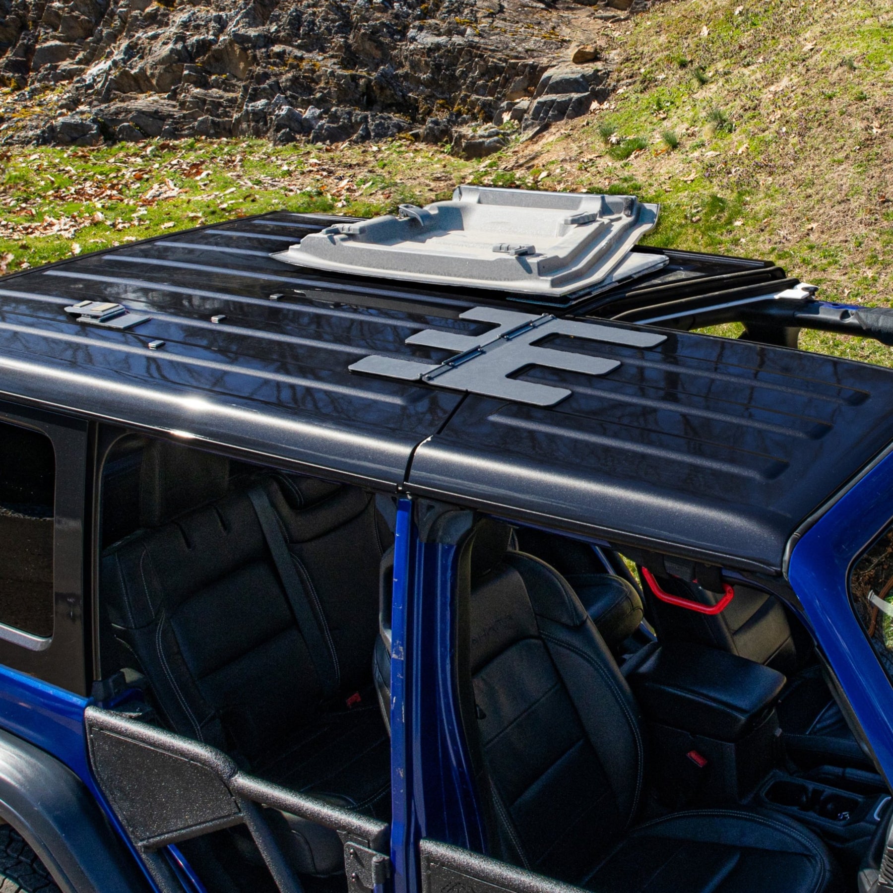 - Flips and locks front roof panels to the roof in seconds for instant, hassle-free open-air driving.